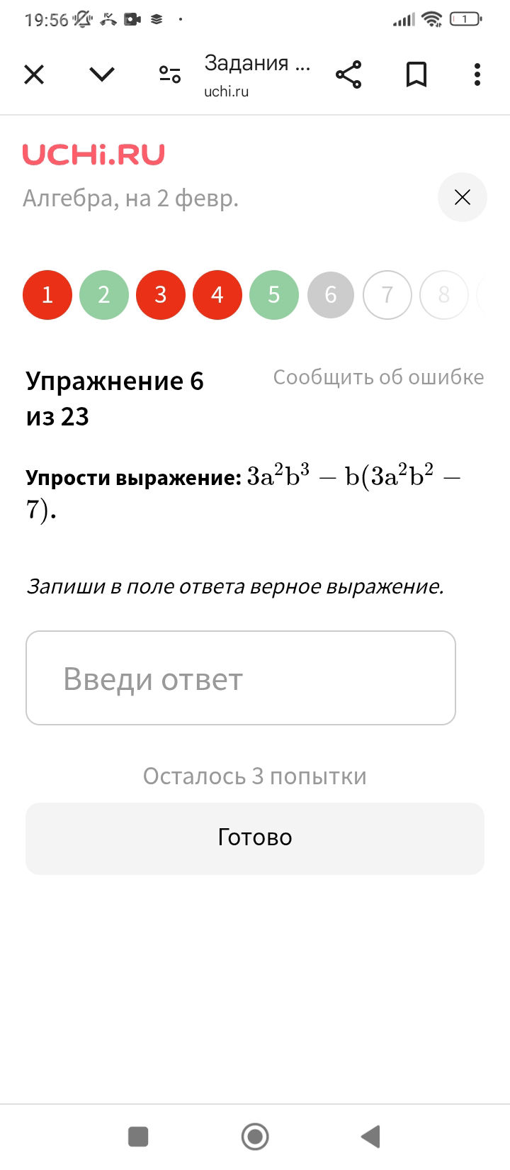 3a^2b^3 - b(3a^2b^2 - 7) = 3a^2b^3 - 3a^2b^3 + 7b = 7b