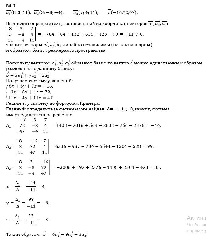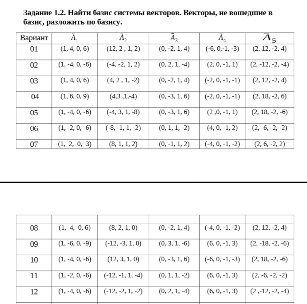Задание 2. Найти базис системы векторов. Векторы, не вошедшие в базис, разложить по базису.