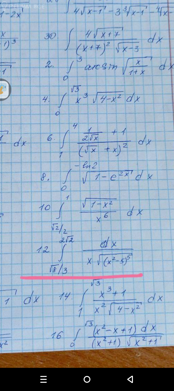 [m]\int \limits_{\sqrt{8}/3}^{\sqrt{8}} \frac{dx}{x \cdot \sqrt{(x^2-5)^5}} = \frac{\sqrt{5}}{125} \cdot arctg \frac{\sqrt{x^2 - 5}}{\sqrt{5}} |_{\sqrt{8}/3}^{\sqrt{8}} + \frac{1}{25\sqrt{x^2 - 5}} |_{\sqrt{8}/3}^{\sqrt{8}} - \frac{1}{15\sqrt{(x^2 - 5)^3}} |_{\sqrt{8}/3}^{\sqrt{8}}[/m]