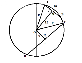 CN = sqrt(OC^2 - ON^2) = sqrt(13^2 - 5^2) = 12