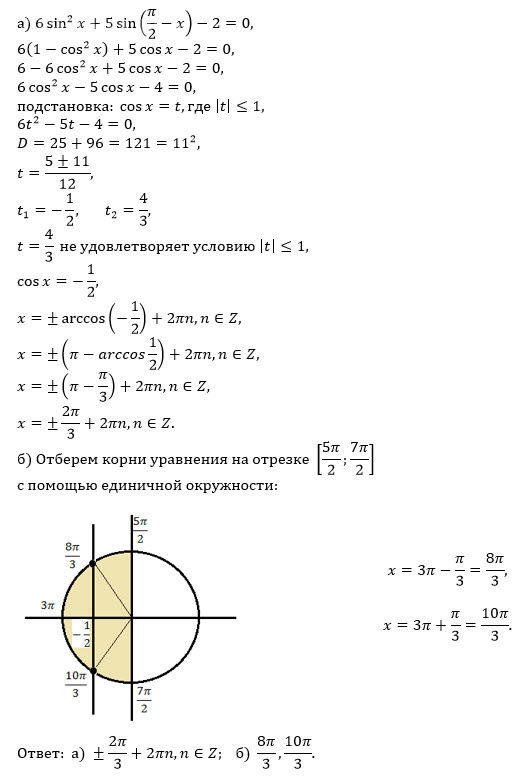 a) Решите уравнение: 6sin2x + 5sin(p/2 – x) – 2 = 0 б) Найдите все корни этого уравнения, принадлежащие отрезку [5p/2 ; 7p/2]