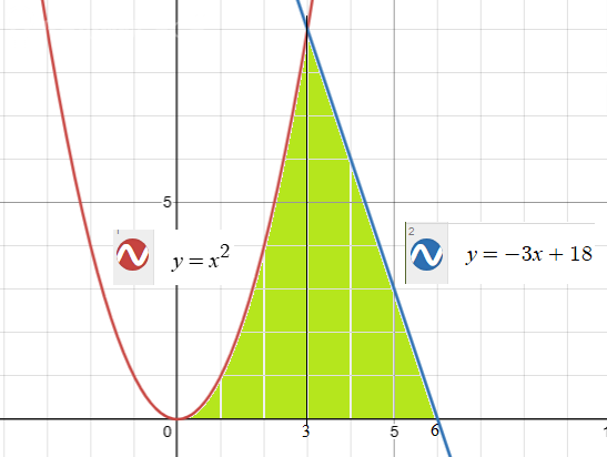 [m]S=\int \limits_0^3 x^2 dx + \int \limits_3^6 (-3x + 18) dx = \frac{x^3}{3} \bigg |_0^3 + (- \frac{3x^2}{2} + 18x) \bigg |_3^6 =[/m]