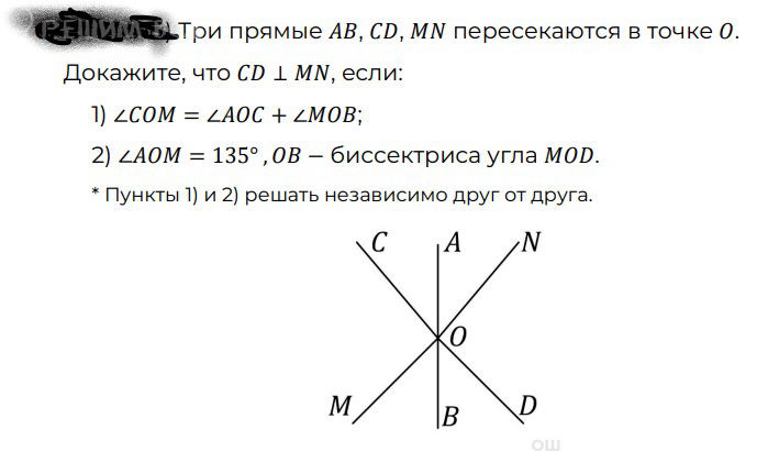 2) угол AOM = 135°, OВ - биссектриса угла MOD.