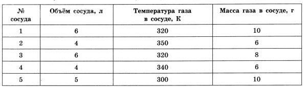 20) Ученику необходимо на опыте обнаружить зависимость давления газа, находящегося в сосуде, от массы газа. У него имеются пять различных сосудов с манометрами. Сосуды наполнены аргоном разной массы при различных температурах (см. таблицу).