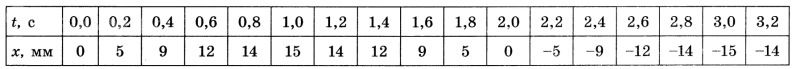 Максимальное по модулю смещение |x|max = 15 мм (при t = 1,0 с и t = 3,0 с).