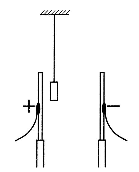 • Внутренний заряд гильзы остаётся нулевым, но возникает диполь. Так как сила притяжения к ближнему заряду пластины (~1/r²) больше, чем отталкивание от дальнего, на гильзу действует результирующая сила, направленная к одной из пластин. Малейшая асимметрия приводит к тому, что гильза сначала притянется, например, к левой (положительной) пластине.