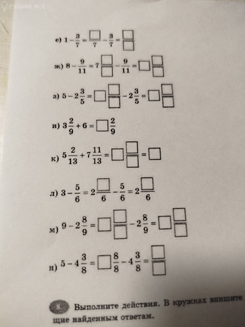 ж) [m]\large 8 - \frac{9}{11} = 7 \frac{11}{11} - \frac{9}{11} = 7 \frac{2}{11}[/m]