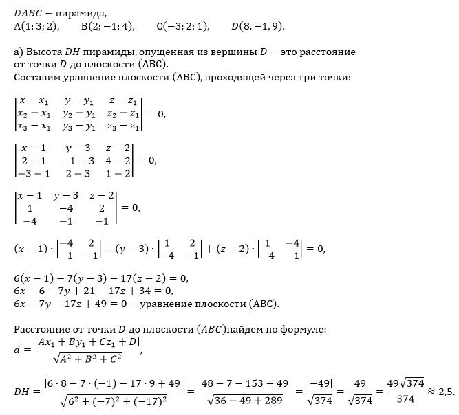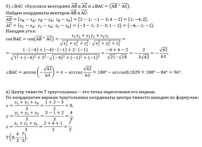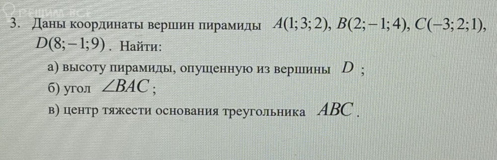 3. Даны координаты вершин пирамиды [m]A(1;3;2), B(2;-1;4), C(-3;2;1), D(8;-1;9)[/m]. Найти: а) высоту пирамиды, опущенную из вершины [m]D[/m]; б) угол [m]\angle BAC[/m]; в) центр тяжести основания треугольника [m]ABC[/m].
