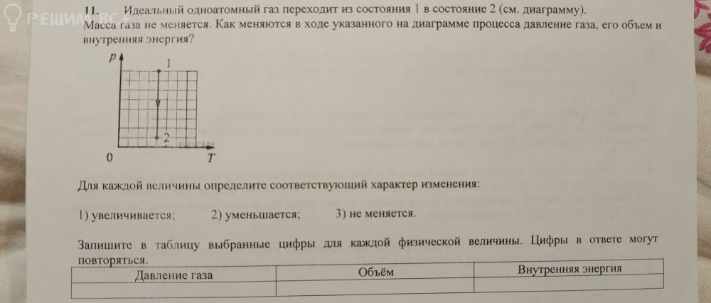 Идеальный одноатомный газ переходит из состояния 1 в состояние 2(см. диаграмму). Масса газа не меняется. Как меняются в ходе указанного на диаграмме процесса давление газа, его объём и внутренняя энергия? Для каждой величины определите соответствующий характер изменения: 1) увеличивается; 2) уменьшается; 3) не меняется.
