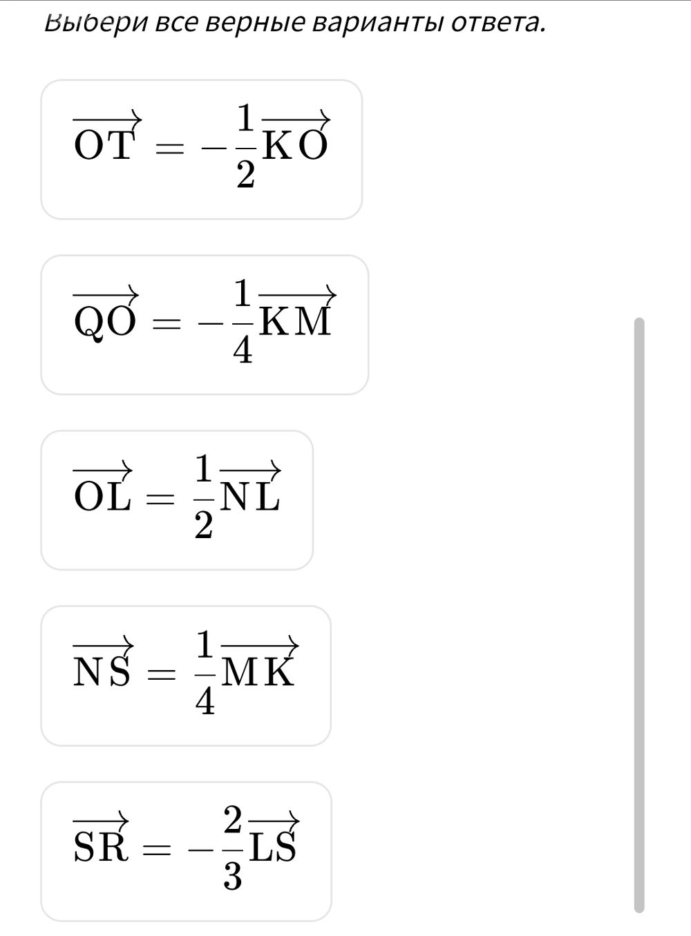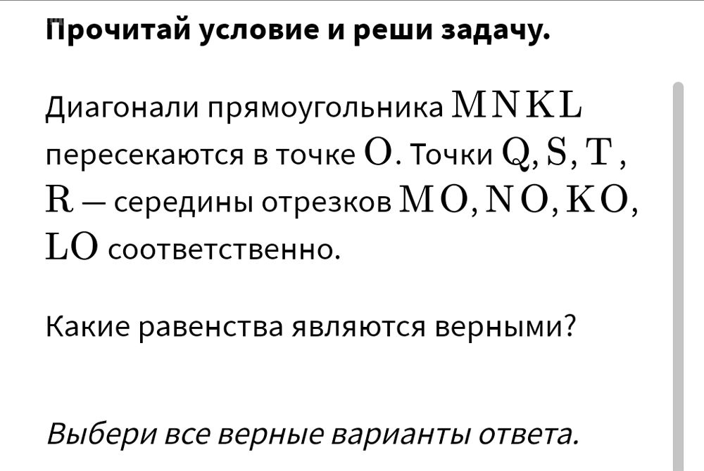 помогите пожалуйста ????????????, срочно Прочитай условие и реши задачу. Диагонали прямоугольника MNKL пересекаются в точке O. Точки Q, S, T, R — середины отрезков MO, NO, KO, LO соответственно. Какие равенства являются верными? Выбери все верные варианты ответа.