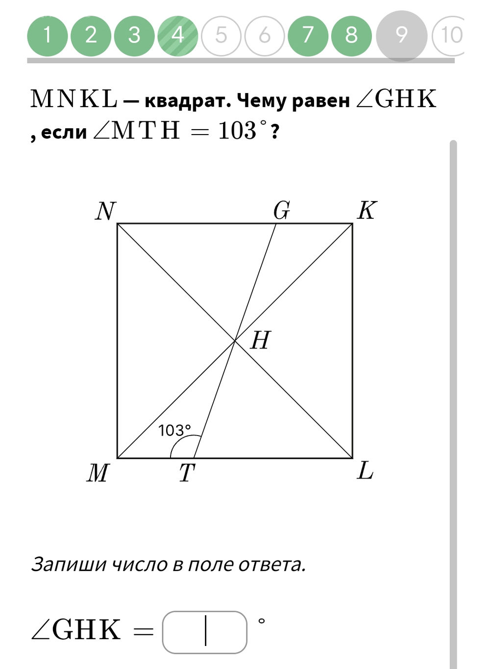 умные люди, помогите пожалуйста!???????????????????????? MNKL — квадрат. Чему равен ∠GHK, если ∠MTH = 103°? Запиши число в поле ответа. ∠GHK = ⬜ °
