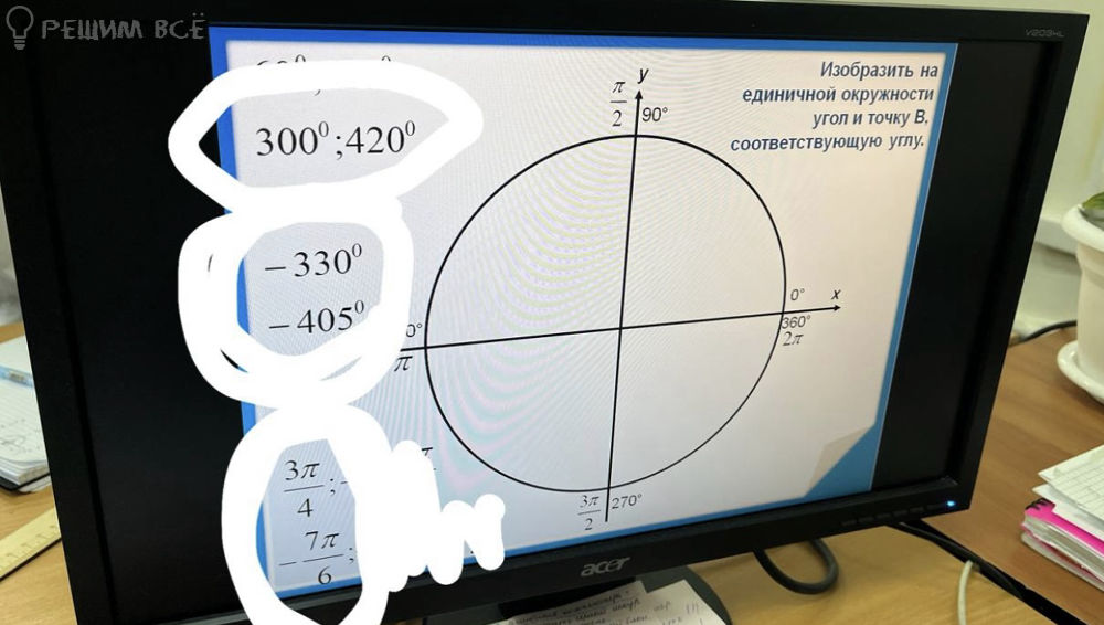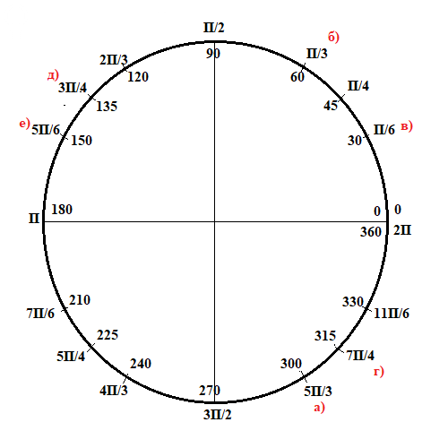 а)300 °;б)420 ° ;в)-330 ° ;г)-405 °; д)3π/4; е)-7π/6
