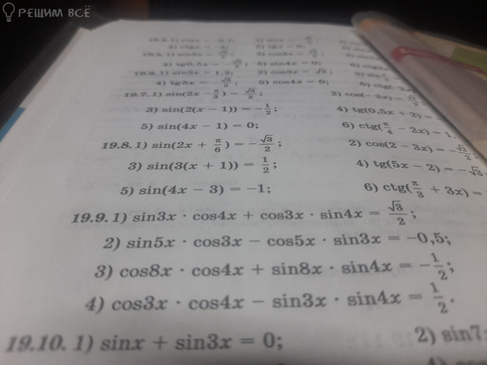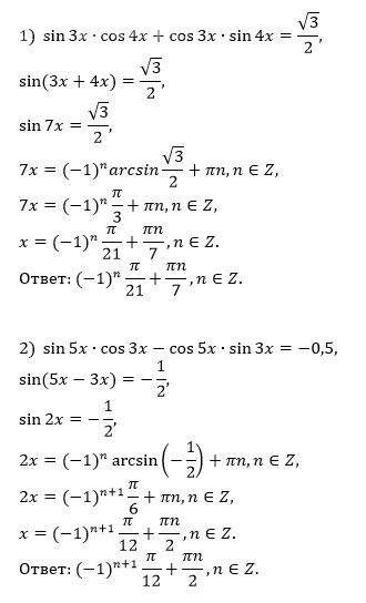 Помогите решить 19.9 номер 19.9.1) sin3x · cos4x + cos3x · sin4x = √3/2 ; 2) sin5x · cos3x – cos5x · sin3x = –0,5; 3) cos8x · cos4x + sin8x · sin4x = –1/2; 4) cos3x · cos4x – sin3x · sin4x = 1/2.