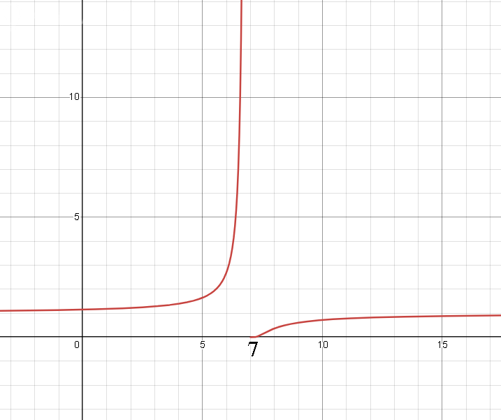 Функция не определена в точке x=7, так как (7-х) - знаменатель дроби (1/(7-х))