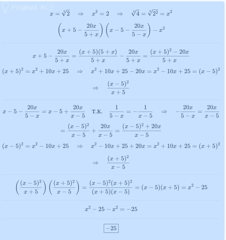 ( t + 5 − 20t/(5 + t) )·( t − 5 − 20t/(5 − t) ) − √4. (1)