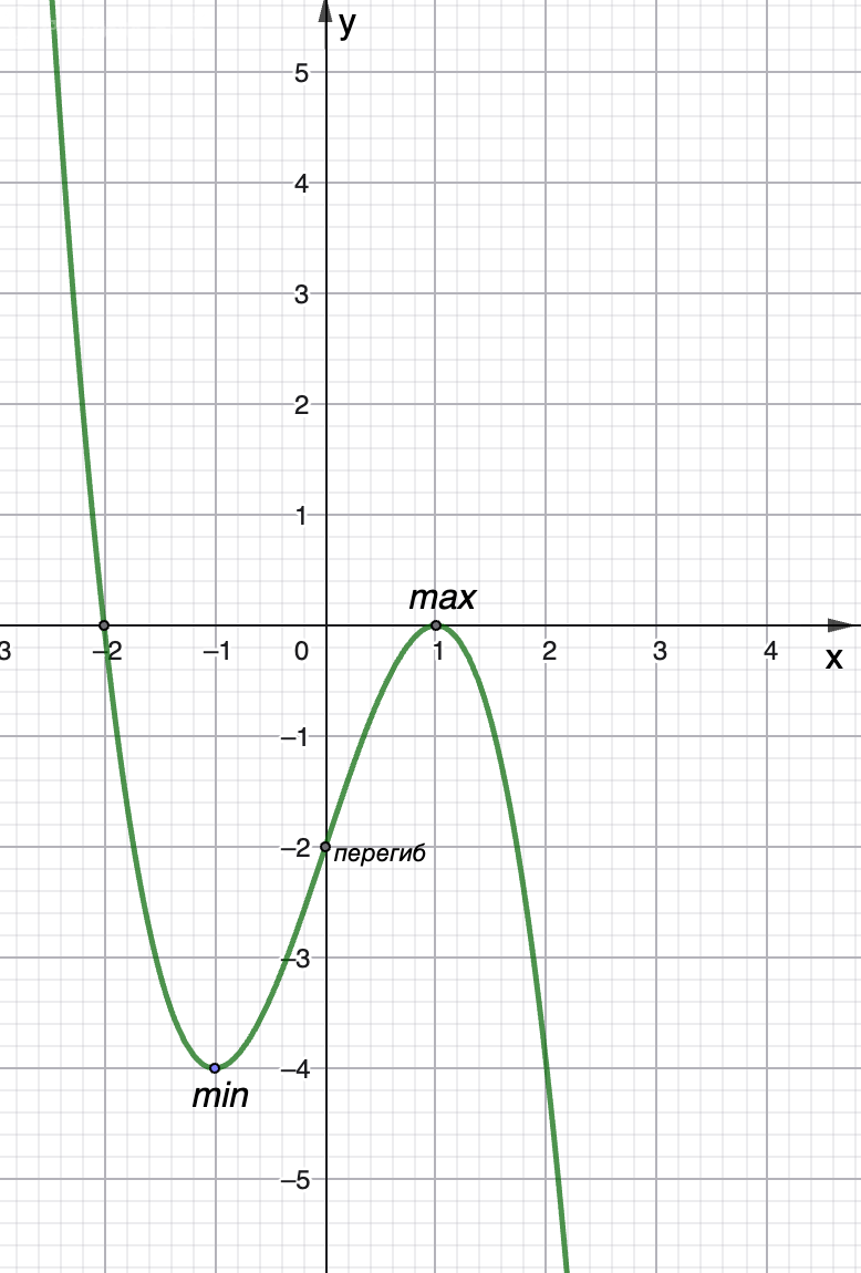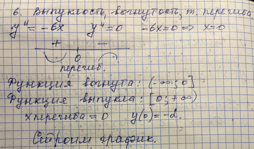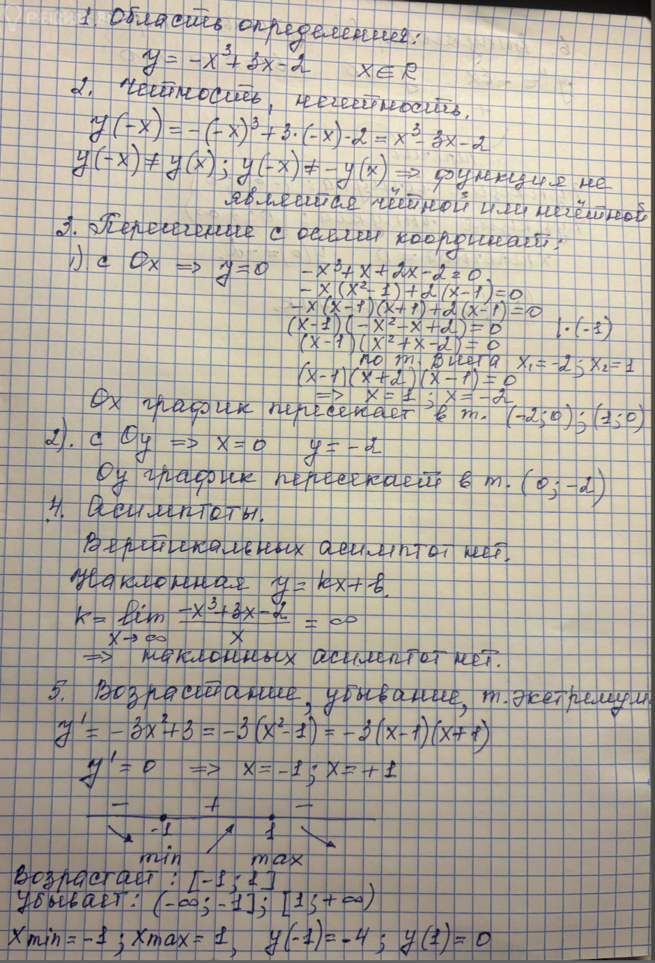 Исследовать функцию -x³+3x-2 1) Область определения 2) Вид фукнции 3) Метод интервалов 4) Точки экстремума 5) Промежутки выпуклости 6) Асимптомы 7) График 8) Точки перегиба
