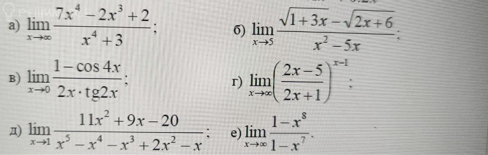 е) [m]\lim \limits_{x \to \infty} \frac{1- x^8}{1 - x^7} = \lim \limits_{x \to \infty} \frac{x^8 - 1}{x^7 - 1} = \lim \limits_{x \to \infty} \frac{1 - 1/x^8}{1/x - 11/x^8} = \frac{1 - 0}{0 - 0} = \infty[/m]