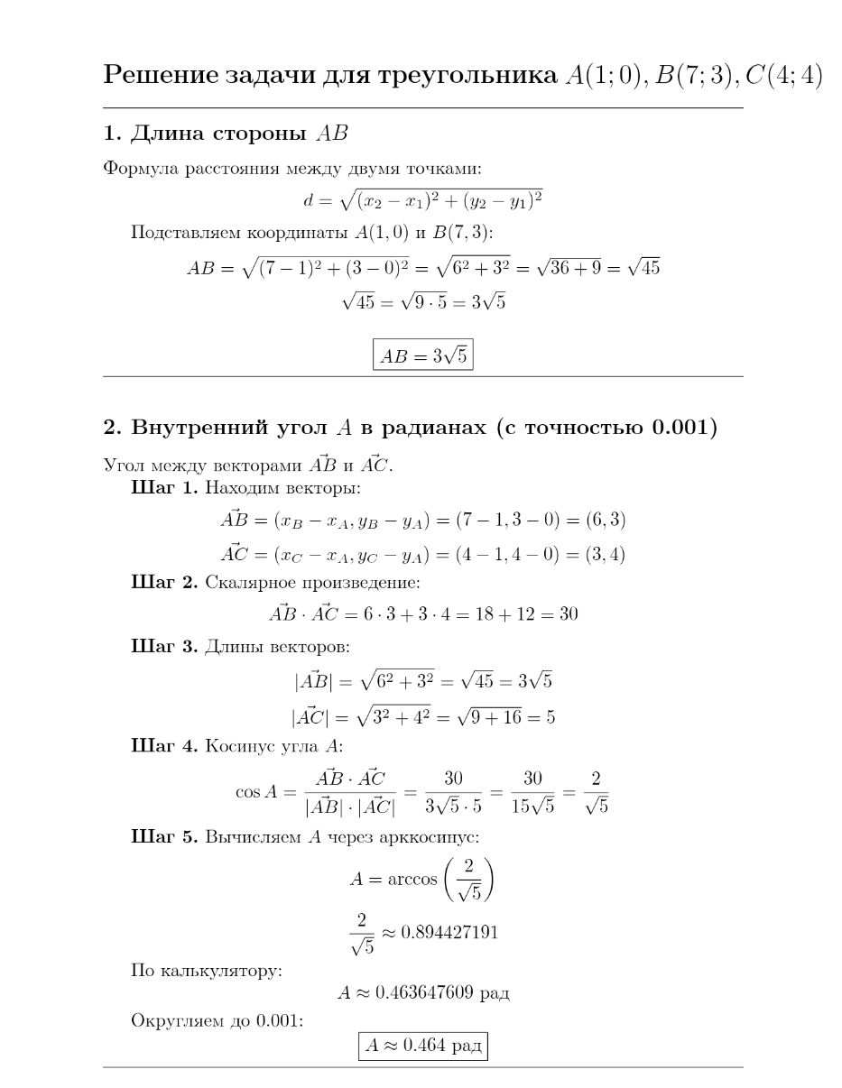 1) длину стороны АВ; 2) внутренний угол А в радианах с точностью до 0,001;