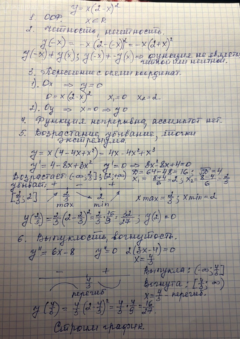 Провести полное исследование функции и построить её график:y=x(2-x)²