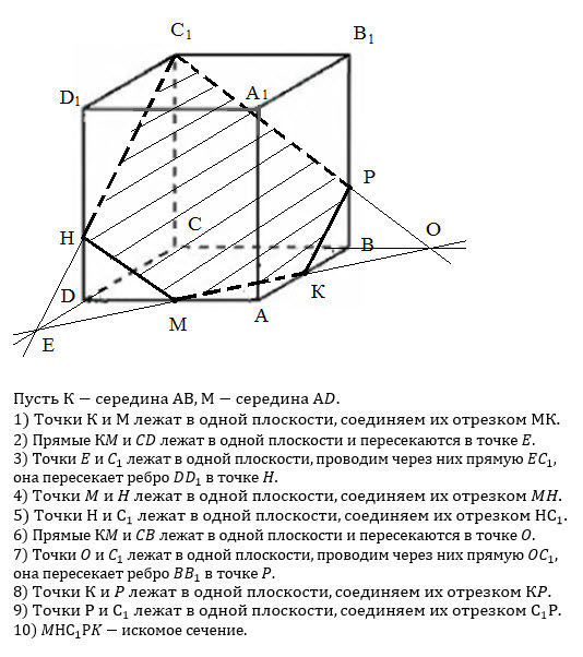 постройте сечение Куба ABC...D плоскостью, проходящей через вершину С1 и середины ребер AB и AD