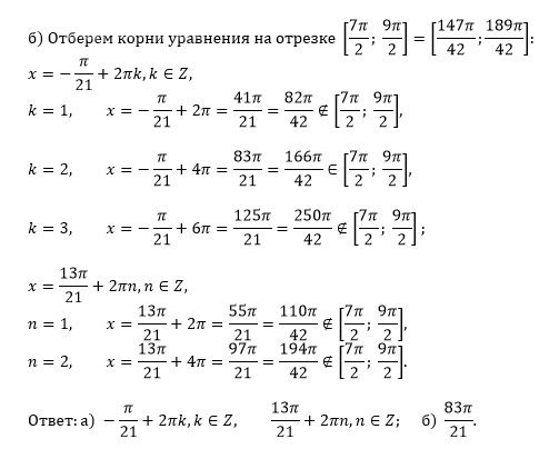 [m] \frac{7π}{2}≤ -\frac{π}{21} +2πn ≤\frac{9π}{2} [/m], n ∈ [b]Z[/b] или [m]\frac{7π}{2}≤\frac{13π}{21} +2πn ≤\frac{9π}{2}≤ [/m], n ∈ [b]Z[/b]