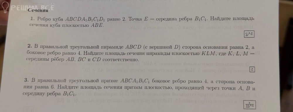 3. В правильной треугольной призме ABCA1B1C1 боковое ребро равно 4, а сторона основания равна 6. Найдите площадь сечения призмы плоскостью, проходящей через точки A, B и середину ребра B1C1.