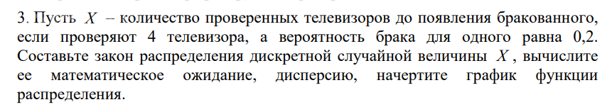 [m]F(x)=\left\{\begin {matrix}0, x ≤ 1\\0,2; 1 <x ≤ 2\\0,36;2< x ≤ 3\\ 0,488; 3< x ≤ 4,\\ 1, x > 4\end {matrix}\right.[/m]