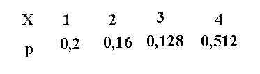 M(X)=1*p_(1)+2*p_(2)+3*p_(3)+4*p_(4)=1*0,2+2*0,16+3*0,128+4*0,512=0,2+0,32+0,384+2,048=2,952
