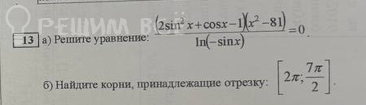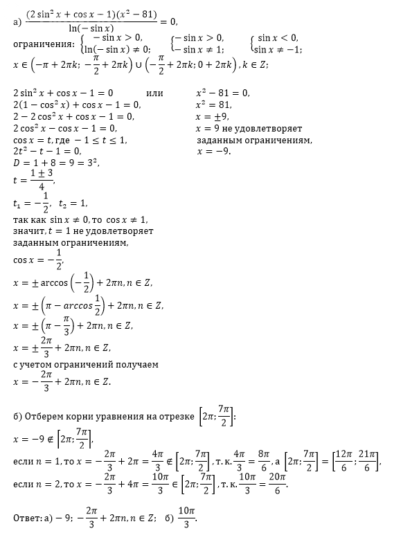 13 а) Решите уравнение: [m]\frac{(2\sin^2 x + \cos x - 1)(x^2 - 81)}{\ln(-\sin x)} = 0[/m]. б) Найдите корни, принадлежащие отрезку: [m]\left[2\pi; \frac{7\pi}{2}\right][/m].