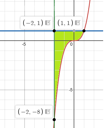 Следовательно, ограниченная область – это «лента» между линиями y = 1 (сверху) и y = x³ (снизу) при –2 ≤ x ≤ 1.