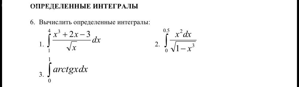 3) [m]\int \limits_0^1 arctg\ x\ dx = x \cdot arctg\ x - \frac{1}{2} \ln |1 + x^2| \bigg |_0^1 =[/m]