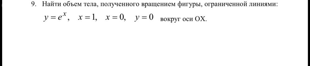 Ответ: [m]V = \frac{\pi}{2} \cdot (e^2 - 1) ≈ 10,036[/m]