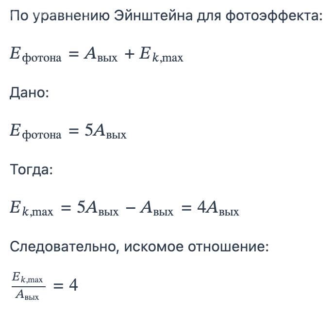 Энергия фотона падающего на поверхность металлической, в 5 раз больше работы выхода электрона с поверхности этого металла. Каково отношение максимальной кинетической энергии фотоэлектрона к работе выхода?