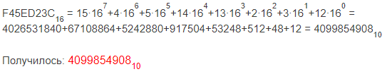 Переведем шестнадцатеричное число F45ED23C в десятичное: