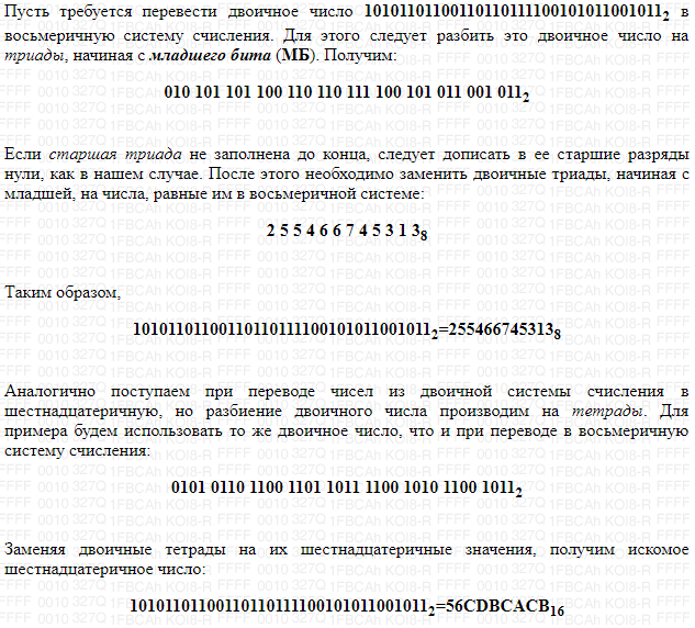 Чтобы перевести из двоичной сс в восьмеричную (шестнадцатеричную) следует разбить это двоичное число на триады (по 3) (тетрады (по 4)), начиная с младшего бита. Если старшая триада (тетрада) не заполнена до конца, следует дописать в ее старшие разряды нули. После этого необходимо заменить двоичные триады (тетрада), начиная с младшей, на числа, равные им в восьмеричной (шестнадцатеричной) системе.