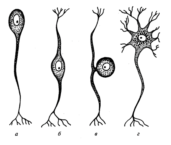 Б - биполярный. Есть аксон и дендрит. Немногочисленны в теле человека, например, в сетчатке глаза и внутреннем ухе.