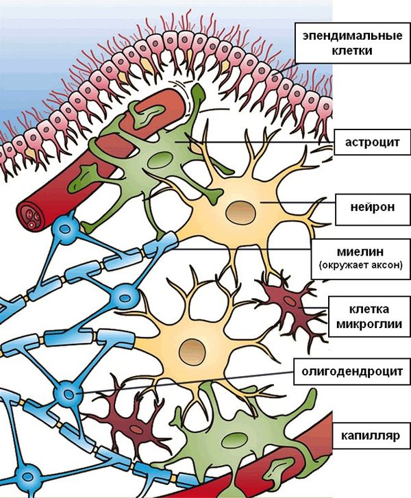 2. Макроглия – астроциты, олигодентроциты и шванновские клетки. Астроциты прилегают к кровеносным сосудам и создают гемато-энцефалический барьер, переносят к нейронам питательные вещества и кислород, поддерживают баланс нейромедиаторов. Олигодентроциты и шванновские клетки образуют миелиновую оболочку нервов.