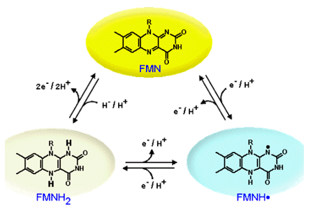 ФМН может отдавать/получать один электрон с преобразованием в радикал или полностью окисляться/восстанавливаться с передачей двух электронов и протонов (рис.1).