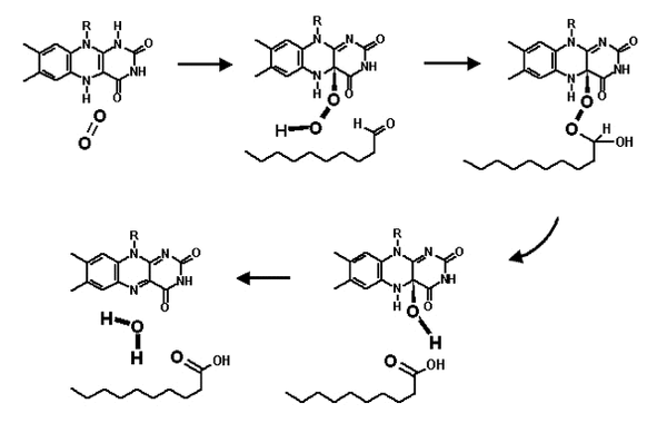 В люциферазном комплексе кислород взаимодействует с люциферином и альдегидом с образованием нестабильного пероксида (пероксихемиацеталя), а тот затем быстро распадается и образуются вода, испускающий свет оксилюциферин и жирная кислота. Эти реакции представлены на рисунке 2.