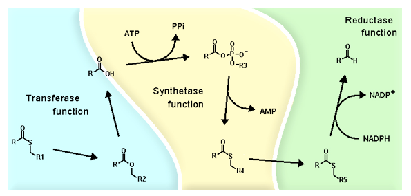 Для протекания реакции биолюминесценции необходимо постоянное наличие следовых количеств альдегидов в клетке. Регенерацию альдегидов осуществляет редуктаза жирных кислот, закодированная lux-опероне. Гены редуктазы (luxC, luxD, и luxE) в опероне следуют прямо за генами, кодирующими люциферазу. Этот белок находится в плазматической мембране, как и другие ферменты участвующие в образовании свечения. Редуктаза жирных кислот представляет собой мультиферментный комплекс и включает трансферазу (luxD), синтетазу (luxE) и собственно редуктазу (luxC). Трансфераза связывает активированные формы жирных кислот, полученных в пути биосинтеза, затем гидролизует эфир до жирной кислоты и передает ее на синтетазу. Синтетаза активирует жирную кислоту с помощью АТФ, взаимодействует с полученным ацил-АМФ и ковалентно связывает ацильный остаток. На редуктазе происходит взаимодействие тиоэфира жирной кислоты с НАД(Ф)Н и высвобождение альдегида.