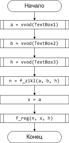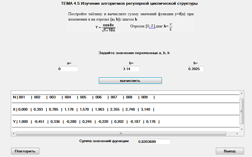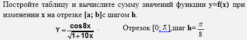 Для решения задачи табуляции функции на заданном интервале следует использовать алгоритмическую структуру регулярного типа, т.к. заданы начальное и конечное значения аргумента, а также шаг его изменения. Таким образом, в данном случае можно заранее определить количество вычисленных значений.