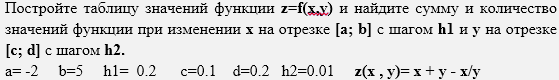 Для решения задачи табуляции функции на заданных интервалах следует использовать алгоритмическую структуру регулярного типа, т.к. заданы начальные и конечные значения аргумента, а также шаги их изменения, то есть в этом случае можно заранее определить количество вычисленных значений