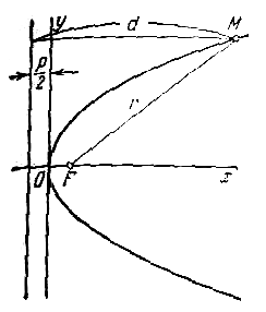Параболой называется геометрическое место точек, для каждой из которых расстояние до некоторой фиксированной точки плоскости, называемой фокусом, равно расстоянию до некоторой фиксированной прямой, называемой директрисой. Фокус параболы обозначается буквой F, расстояние от фокуса до директрисы - буквой р. Число р называется параметром параболы.