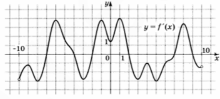 На рисунке изображен график y = f'(x) - производной функции f (x), определенной на интервале (—10; 10). Найдите количество точек максимума функции f(x) , принадлежащих отрезку [—9;8]