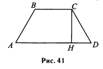 В равнобедренной трапеции ABCD проведена высота СН (см. рис. 41). Точка Н делит большее основание AD на отрезки с длинами 12 и 7. Найдите длину меньшего основания.