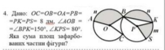 4. Дано: ОС=ОВ=ОА=PB= =PK=РS=8 см, ∠АОВ= =∠ВРK=150°, ∠КРS=80°. Яка сума площ зафарбо- ваних частин фігури?