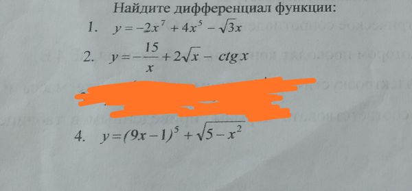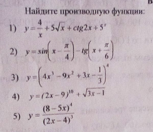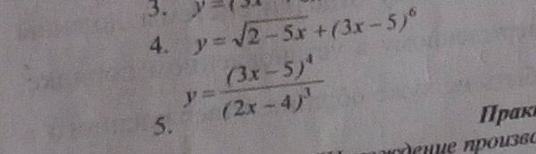 а) y=lnsqrt(x^5 - 4x^2+3) ; б) y=tg3x - 2cos4x ; в) y=e^sqrt(sin4x) ; г) y=[m]\frac{2cos^2x}{sinx}[/m]