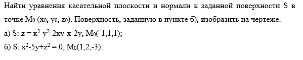 Найти уравнения касательной плоскости и нормали к заданной поверхности S в точке Mo (хо: уо, zo). Поверхность, заданную в пункте б): изобразить на чертеже.
