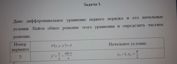 Получить частное решение линейного дифференциального уравнения первого порядка.