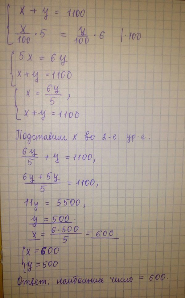 Сумма двух чисел равна 1100. Найдите наибольшее из них, если 6% одного из них равны 5% другого.